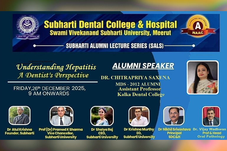 Department of Oral and Maxillofacial Pathology & Oral Microbiology, Subharti Dental College & Hospital, Meerut organized an Alumni guest lecture on 26th December 2025 on the topic “Understanding Hepatitis -A Dentist’s Perspective”. The lecture was delivered by Dr. Chitrapriya Saxena, Assistant Professor, Kalka Dental College, Meerut. The lecture highlighted the importance of hepatitis, its infection control, awareness regarding transmission risks in dental practice, and the dentist’s role in prevention and patient education. The program ended with felicitation of the guest speaker. The webinar was attended by more than two hundred & fifty participants.