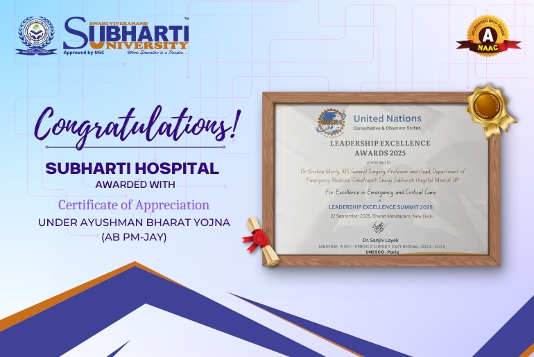 Subharti Hospital has been awarded a Certificate of Appreciation by the District Magistrate for its exemplary performance under the Ayushman Bharat Pradhan Mantri…
