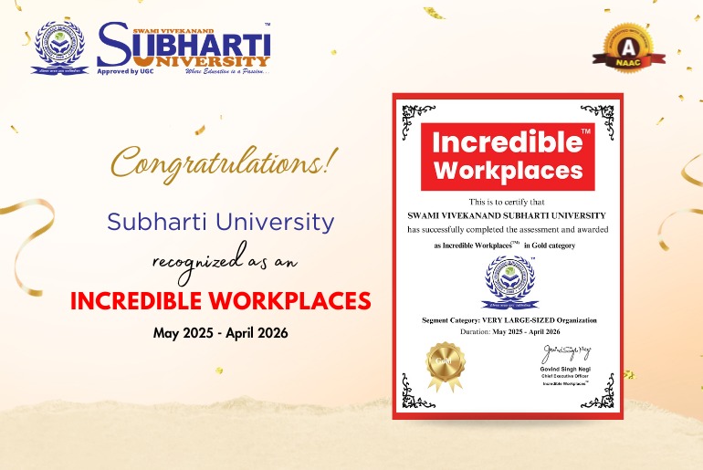 Incredible Workplaces Gold Certification We take immense pleasure to announce that Swami Vivekanand Subharti University has been awarded the prestigious Incredible Workplaces™ Gold Certification in the Very Large Sized category. This esteemed recognition highlights the university's strong commitment to fostering a culture of excellence, inclusivity, and employee well-being. Through innovative workplace practices and a focus on holistic development, Subharti University