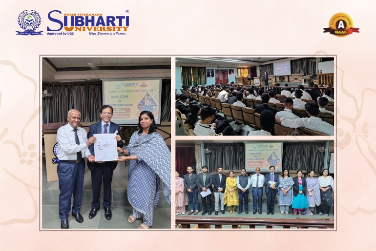 Guest Lecture on “Domestic Arbitration” was organized by Sardar Patel Subharti Institute of Law (Faculty of Law) in Sardar Patel Auditorium on 31.03.2026 at 10.00 A.M. onwards. The objective of the programme was to enhance students’ understanding of arbitration as an alternative dispute resolution mechanism within the domestic legal framework. The event was organized under the guidance of Hon’ble Justice Rajesh Chandra, Director (Former Judge, High Court of Judicature at Allahabad), and Prof. (Dr.) Reena Bishnoi, Officiating Dean, Faculty of Law, S.V.S. University, Meerut.