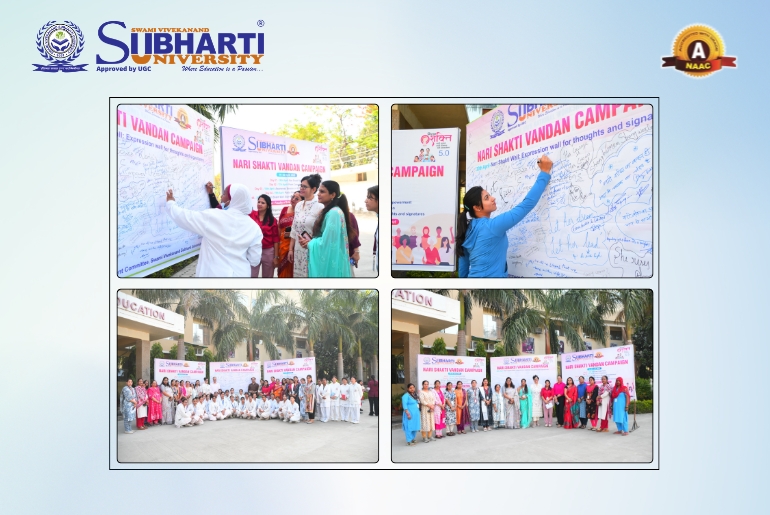 The Nari Shakti Vandan Campaign at Swami Vivekanand Subharti University was successfully conducted on 21st April 2026 with an engaging and meaningful activity titled “Nari Shakti Wall – Expression & Signature Campaign.” The event took place at the Faculty of Education, SVSU, Meerut, where students and staff actively participated to express their thoughts on women empowerment.
